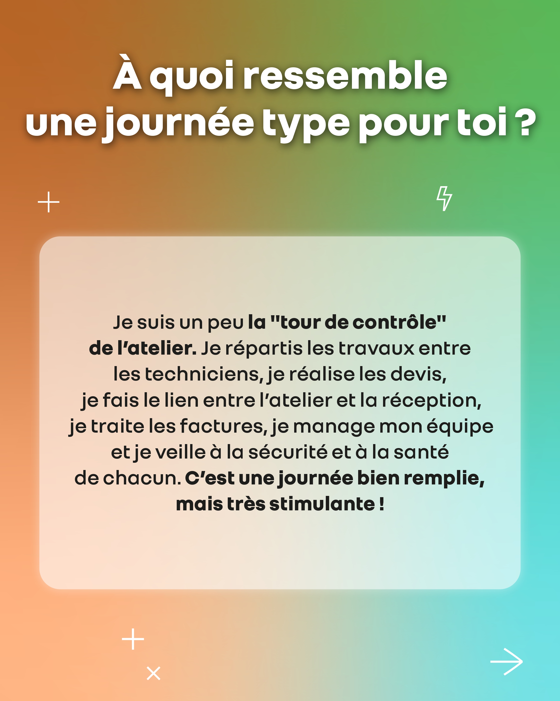 est responsable de l’organisation, le contrôle et la gestion de l’activité de son équipe. Il anime ses collaborateurs afin de satisfaire le client et de développer le chiffre d’affaires de l’atelier.